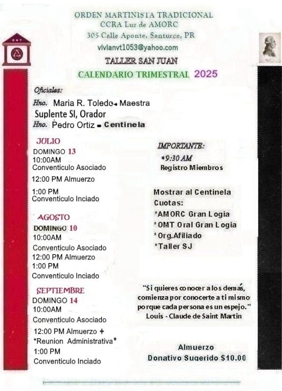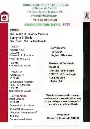 Todos los Miembros AMORC y OMT a Participar en el TALLER MARTINISTA SAN JUAN en el Centro Cultural Rosacruz Luz de AMORC